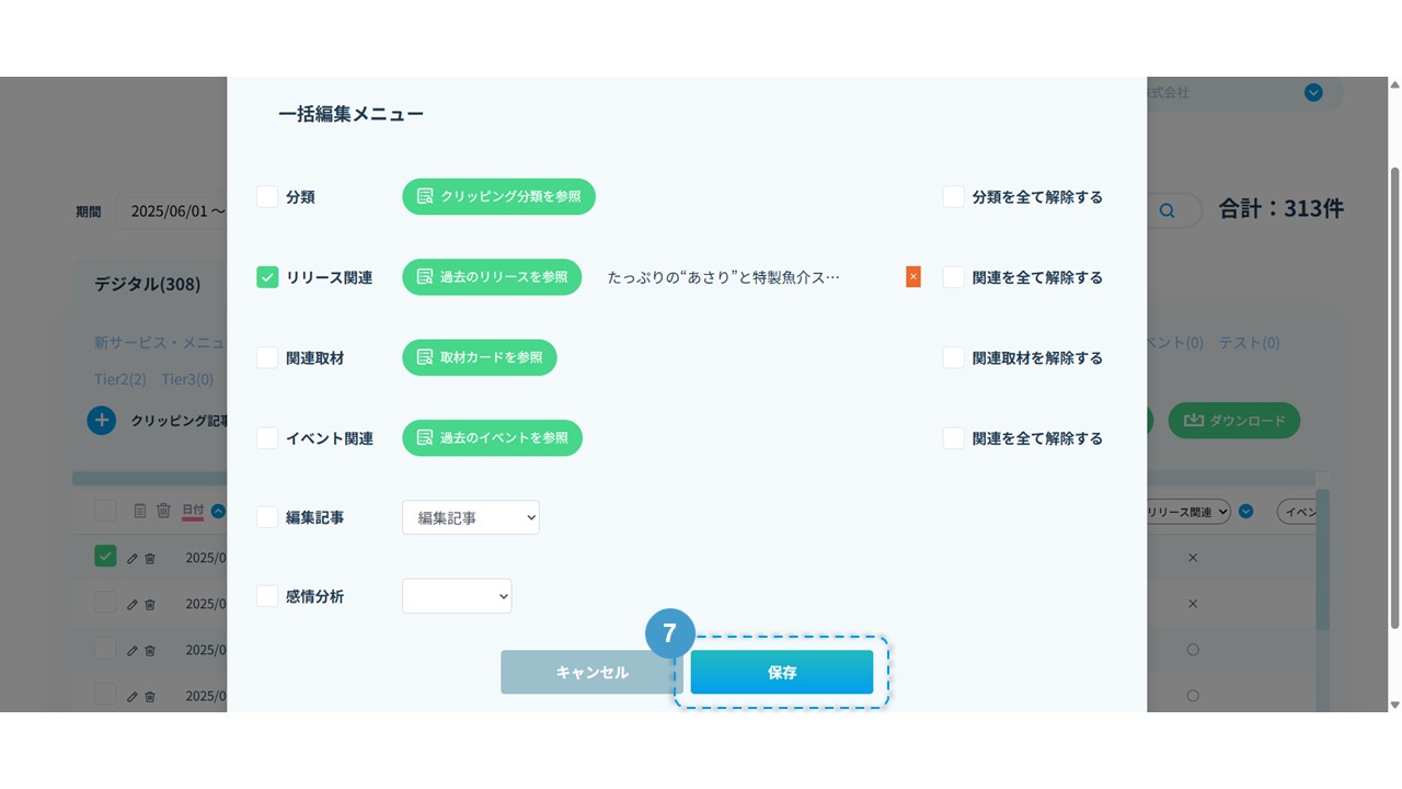 [クリッピング一覧]に記事が取得できていない場合には、記事を手動追加したうえで、リリースとの紐づけを行ってください。