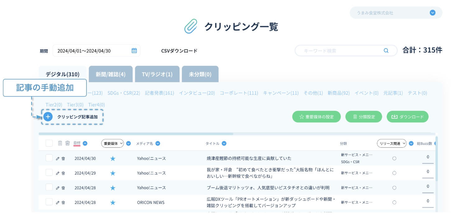 2.「+(クリッピング記事追加)」ボタンをクリックします。