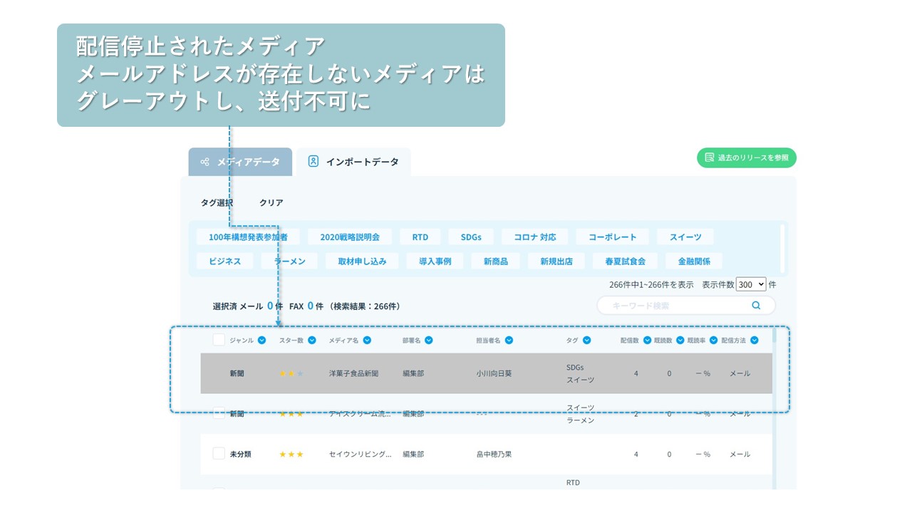 記者一覧でインポートした記者データにおいても同様に、配信停止(オプトアウト)された場合・存在しないメールアドレスの場合・自分(自社)で配信停止している場合はグレーアウトします。