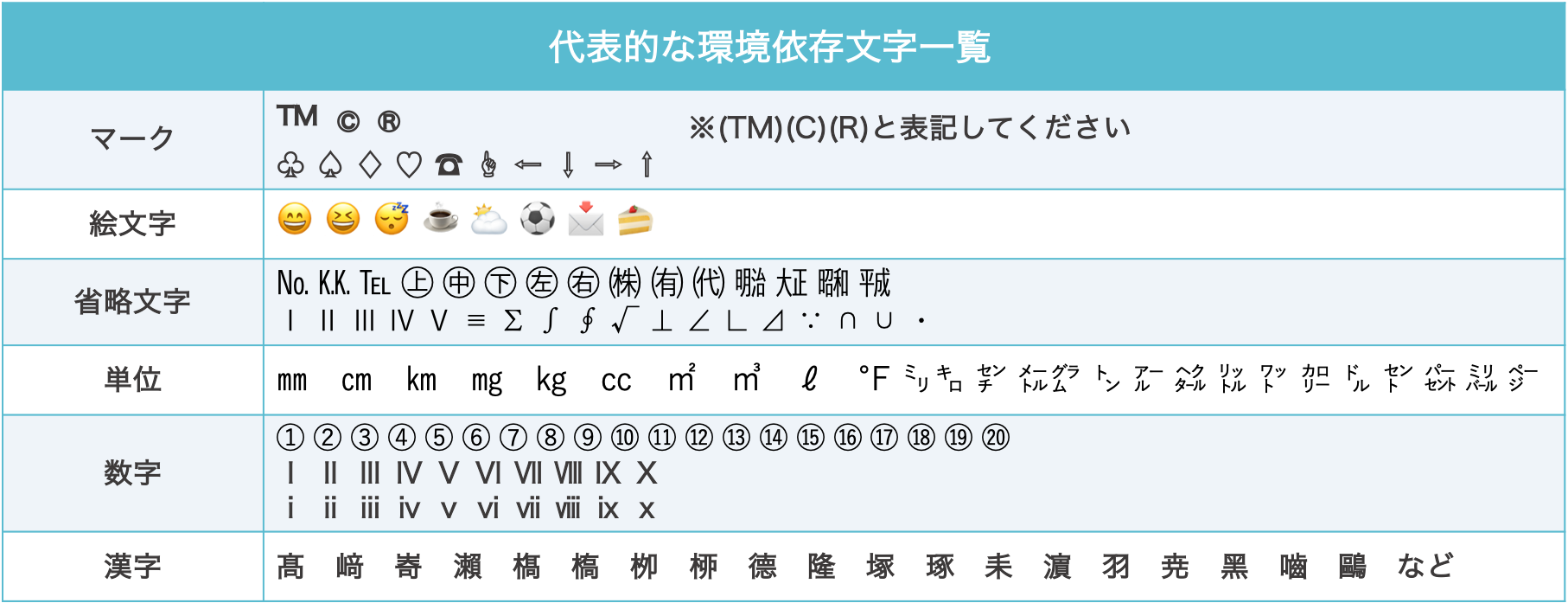 以下のような環境依存文字は、提携メディアやメーラーの仕様により、文字化けする可能性があります。
