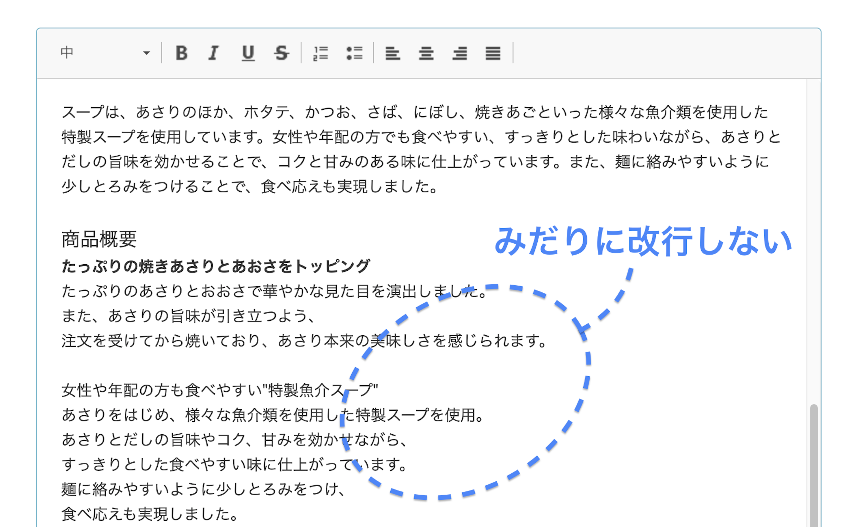 wordなどとは仕様が異なるため、頻繁に改行しないようにしてください。