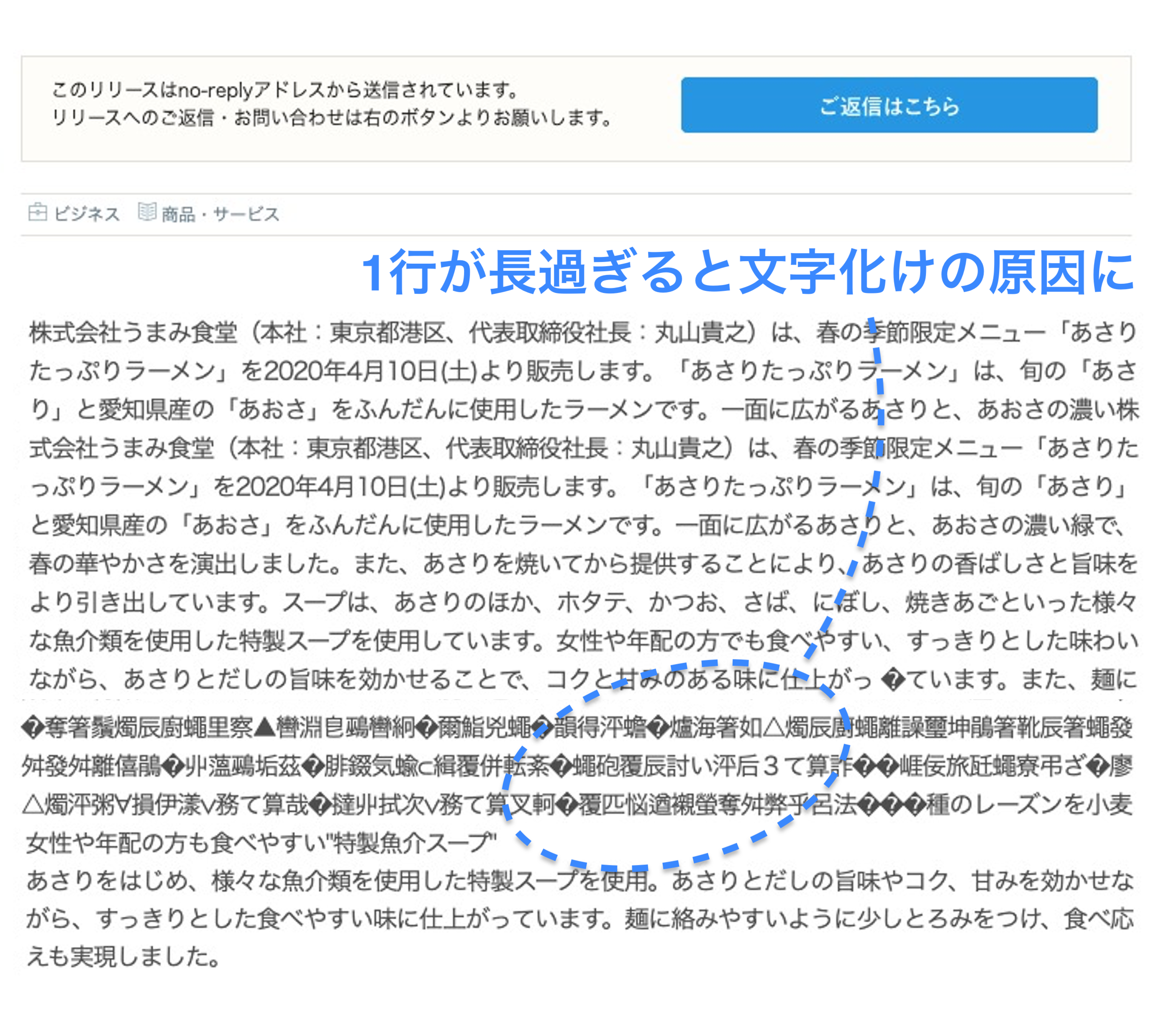 1行あたりの文字数が多すぎると、文字化けの要因となります。