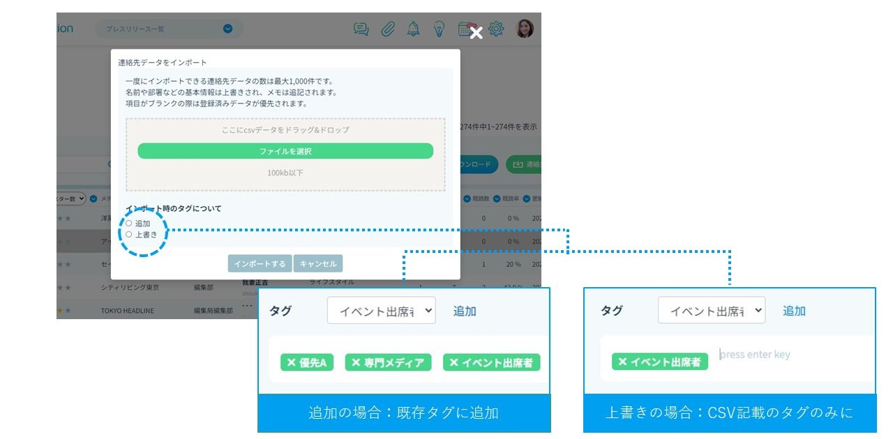 すでに登録済みの記者タグを残して新しい記者タグを追加したい場合には「追加」、CSV記載の記者タグのみにしたい場合には「上書き」をご選択ください。
