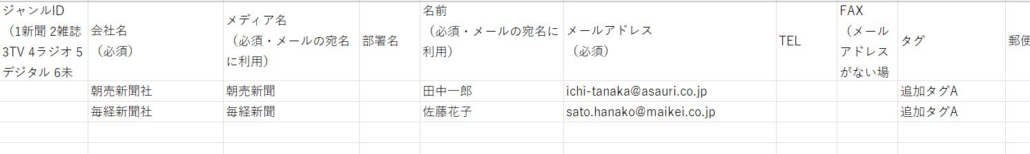 「全送付」「新商品」のタグがついた記者に対して、インポートリストのタグ列に「追加タグA」のみ入れてインポートした場合(以下のデータ)