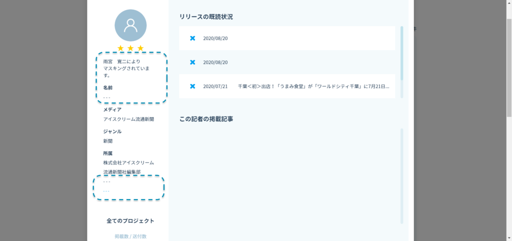 マスクした記者情報は、同じドメイン(メールアドレスの@以下)のメンバーで閲覧・編集・削除が可能です。
