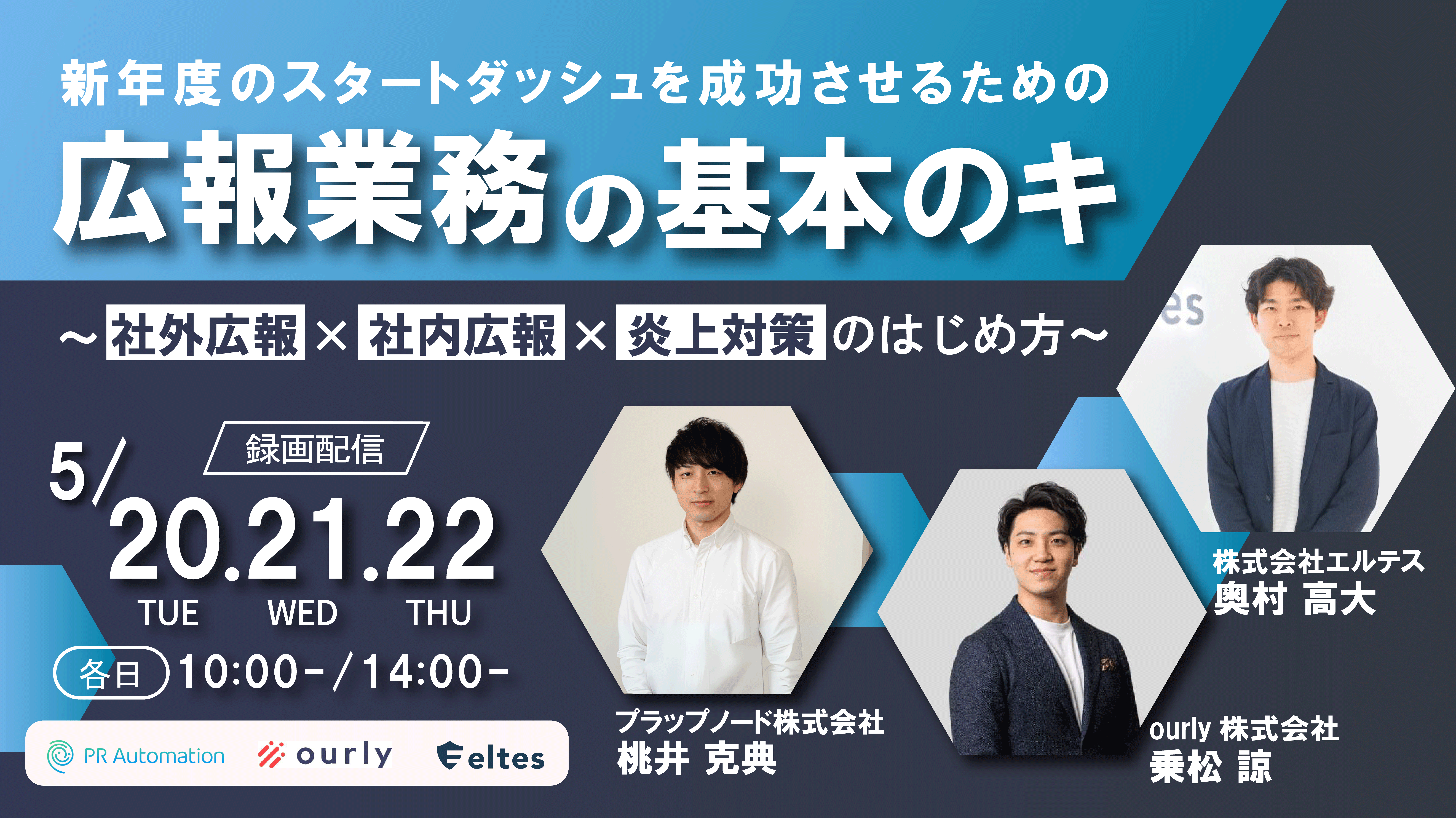 第一部ではプラップノード社から数ある社外広報業務のについて 、第二部ではourly社から組織の関係性を高める社内広報、第三部ではエルテス社から企業のブランドを守るための炎上対策のポイントについて解説いたします。