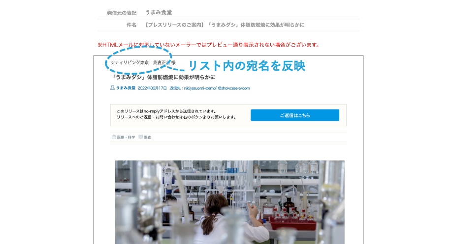 - メール配信のプレビュー・送信テスト時、これまでは「報道関係者各位」という表記だった宛名部分に、リスト内のメディア名を反映するようになりました。