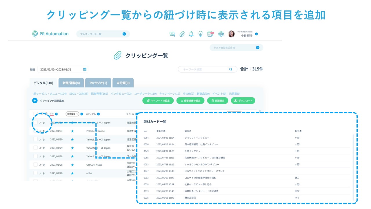 クリッピング一覧で取材カードを紐づける際の項目を増やし紐づけをしやすくしました。