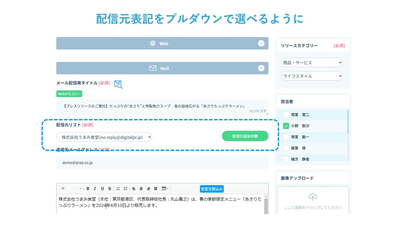 - 配信元リストに事前登録されたものが表示されるため、プルダウンで選択いただけます。