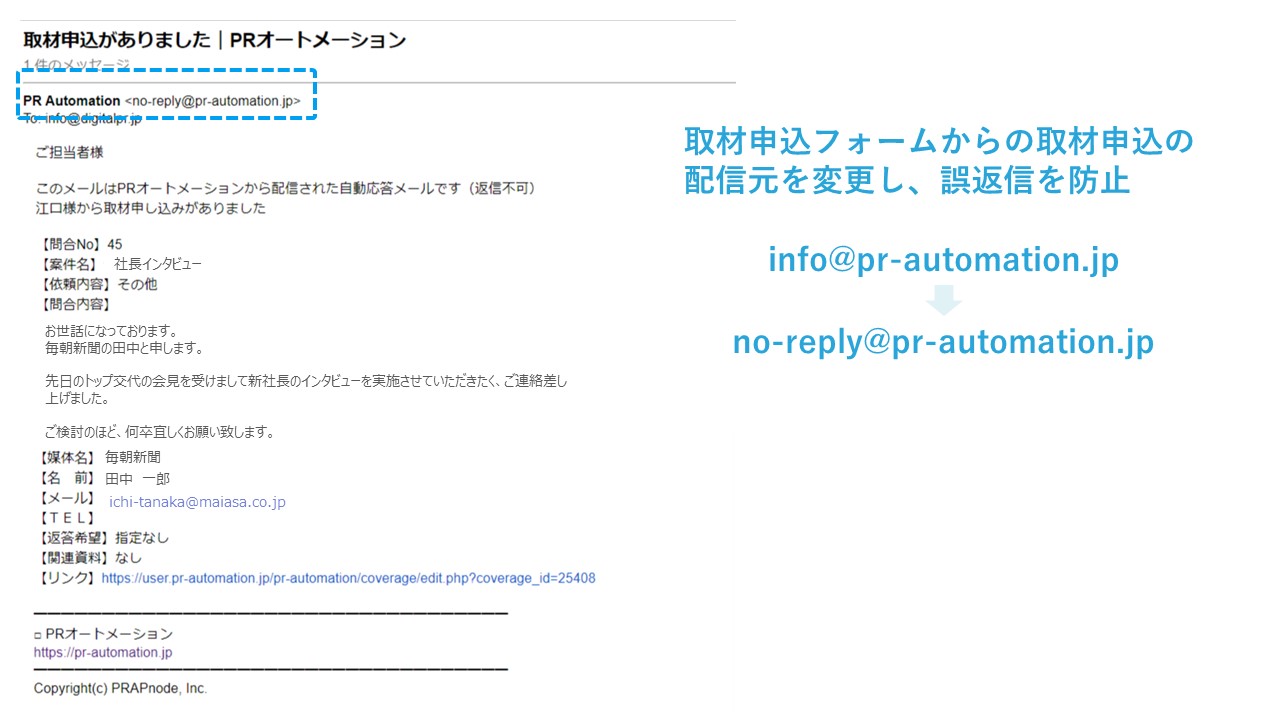 - またあわせて申込を行っていただいたメディアへの問合せ完了メールの配信元もno-reply@stg.pr-automation.jpに変更しました。