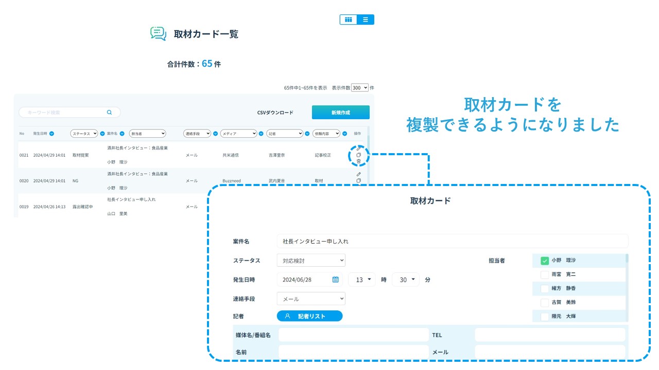 • 取材カードの複製時にはメディア情報や一部項目はコピーされません。またステータスは「対応検討」が選択された状態になります。必要に応じてステータスを変更してご活用ください。