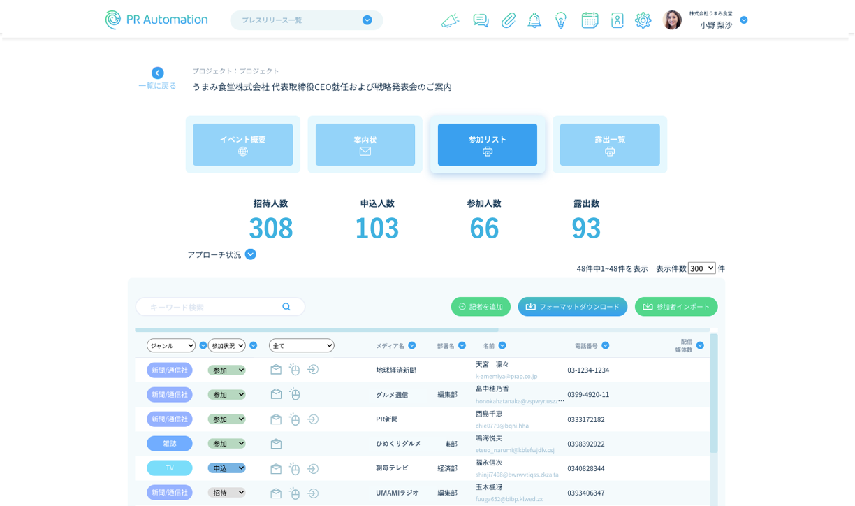 - イベントの申込・出欠状況は自動で記者一覧に反映され、メディアリレーションをより可視化します。